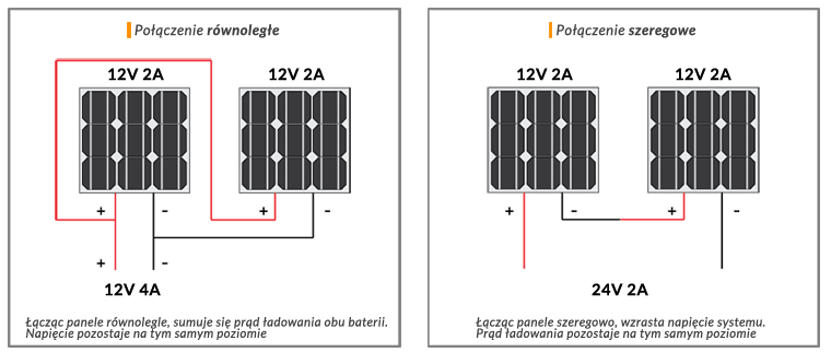 Gdy panele słoneczne są połączone równolegle, dodatni zacisk jednego panelu jest połączony z dodatnim zaciskiem innego panelu, a ujemne zaciski dwóch paneli są ze sobą połączone.
