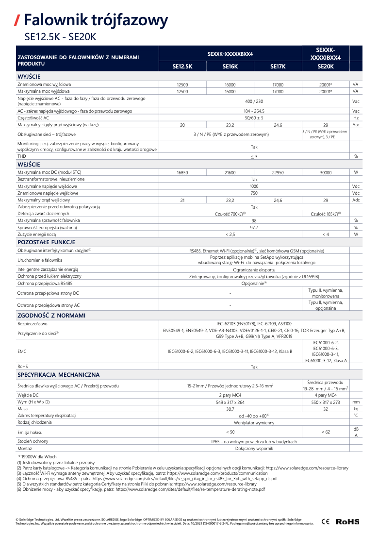 Falowniki SolarEdge z serii SE12.5K–SE20K RW0T0BNN4 to trójfazowe urządzenia przeznaczone do konwersji energii słonecznej w instalacjach fotowoltaicznych. Charakteryzują się wysoką sprawnością, zaawansowanymi funkcjami monitoringu oraz solidną konstrukcją, zapewniając niezawodne działanie i optymalizację produkcji energii.