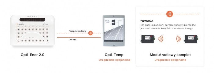Moduł OPTI-TEMP jest podłączany do centralnej jednostki OPTI-ENER przewodem komunikacyjnym lub bezprzewodowo za pomocą Modułu radiowego G931 np. przy większej odległości pomiędzy miejscem zainstalowania jednostki OPTI-ENER i modułu OPTI-TEMP, który zwykle instalowany jest blisko grzałki elektrycznej wbudowanej w podgrzewaczu wody.