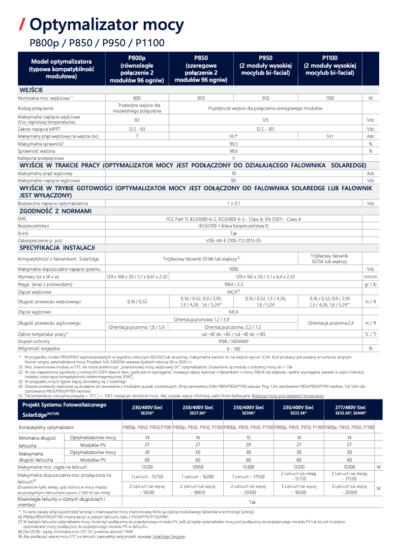 Seria optymalizatorów SolarEdge P650–P1100 została stworzona z myślą o dużych instalacjach komercyjnych i przemysłowych. Dzięki możliwości obsługi dwóch modułów połączonych szeregowo, wyjątkowej sprawności i zgodności z falownikami SolarEdge, rozwiązanie to umożliwia maksymalizację produkcji energii, minimalizację strat oraz poprawę bezpieczeństwa całego systemu. Idealne do projektów o wysokiej mocy i wymaganiach względem długości łańcuchów PV.
